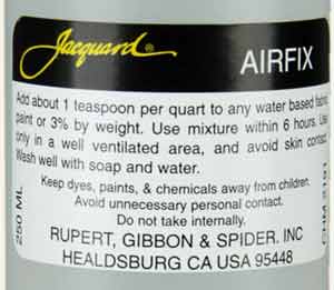 Jacquard Airfix is an additive for Jacquard Textilecolors, Neopaque, and Dye-Na-Flow and most other acrylic fabric paints. Use as a catalyst to fix colors when heat setting is not practical.