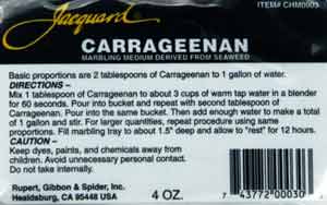 Carageenan is a natural seaweed gelling agent that provides viscosity for marbling on fabric. The carageenan solution should be mixed at least 12 hours in advance. In blender or food processor, put 1 quart of warm water and slowly sprinkle 1 teaspoon of calgon and 2 teaspoons of carageenan with blender running. Blend well and pour into tray. Make as many batches as needed until tray is filled about 1 1/2" deep.