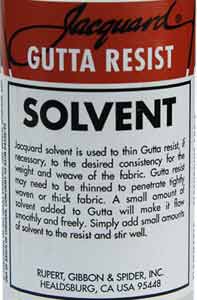 Use Jacquard gutta solvent to thin if necessary. Jacquard has developed a superior water based resist. It washes out easily with warm water, even after steaming. It holds a crisp line without spreading and does not shrink or pucker when dry. It can be colored with any water based dye and is screenable, odorless, alcohol free and non-toxic.