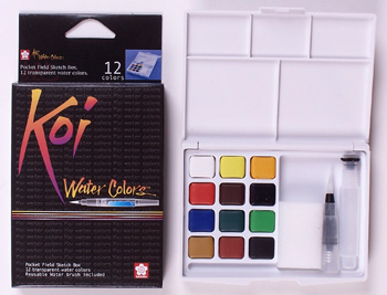 Sakura Koi portable, and easy-to-use "pocket field sketch box". This compact travel kit (4-5/8" x 3-1/2" x 7/8") contains 12 "half pan cakes" in the same colors as the 12 color tube set. Included in the kit is a unique high-quality nylon watercolor brush with a self contained small water reservoir, detachable medium brush tip, and a small sponge. Mixing wells are molded in the inside cover. Weighs only 3.8 ounces. Meets ACMI non-toxicity standards. Included colors: Chinese White, Ivory Black, Prussian Blue, Cobalt Blue Hue, Viridian Hue, Yellow Green, Light Red, Vermillion Hue, Crimson Lake, Yellow Ochre, Lemon yellow and Deep Yellow.
